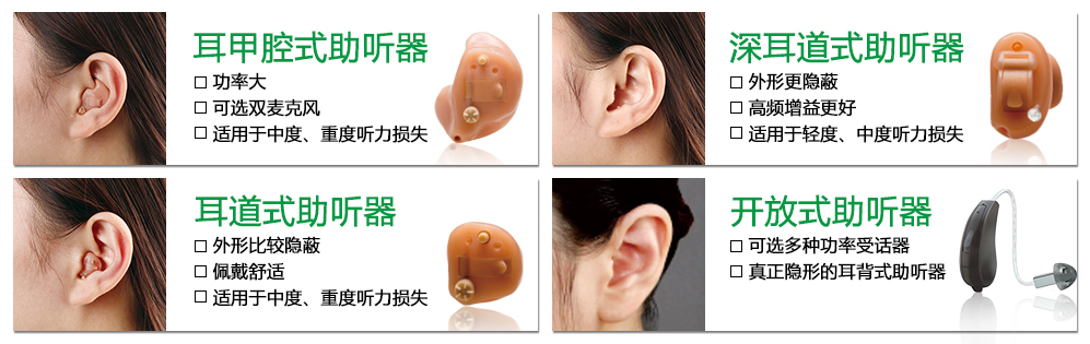 耳內(nèi)式、耳道式、深耳道式及隱形深耳道式助聽器,需要按照患者的耳朵形狀定做,符合患者"將助聽器隱蔽起來(lái)"的心理,助聽器分別位于耳廓內(nèi)、耳道內(nèi)及耳道深部,體積依次減小,但功率也隨體積逐漸減小,只適合輕度到中重度聽力損失。