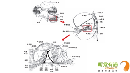 <span style="font-size:16px;"> 內耳或稱迷路,分為三個部分:半規管、前庭和耳蝸,負責聽覺的是耳蝸部分,外有骨殼,名骨迷路。耳蝸,顧名思義,像蝸牛殼一樣,耳蝸旋繞2.5~2.75圈。骨迷路的內壁被骨性螺旋板分成三部分,這三部分組成了三個錐形管腔(階),外面兩層含有淋巴液,頂部是前庭階,底部是鼓階,中間較小的三角形管腔是中階,又叫膜迷路,其中含有聽神經末梢分支。</span></p><p><span style="font-size:16px;"> </span></p><center><span style="font-size:16px;"><img alt="" src="/upfiles/20181116011946651.png" width="440" height="250" /></span></center><p></p><p><span style="font-size:16px;"> 骨迷路(右)</span></p><p><span style="font-size:16px;"> 鐙骨底板在卵圓窗里活動,振動了前庭階的外淋巴液。前庭階和鼓階在蝸孔相匯合,鼓階的另一端是圓窗,正好在卵圓窗和鐙骨底板的下方。中階被薄膜包裹,處于前庭階和鼓階之間,并與它們完全隔離。鐙骨底板在聲波的作用下,推動卵圓窗,使耳蝸內的淋巴液產生波動。顳骨很硬,淋巴液的壓力不能使之產生任何活動,因此,當鐙骨底板向里推動淋巴液時,淋巴液應有一個去處,圓窗部位就是淋巴液流動的方向。中階和前庭階有極薄的膜相隔離,而基底膜分隔中階和鼓階,基底膜是中階里螺旋器的根據地。中階的外壁由螺旋韌帶和微血管叢組成。血管叢可分泌內淋巴液,是內淋巴液化學成分的主要來源,內淋巴液是維持毛細胞功能的必要物質?;啄ど嫌兄е毎让毎?、外毛細胞和膠狀蓋膜等形成的螺旋器,又名Corti’s器。</span></p><p><span style="font-size:16px;"> </span></p><center><span style="font-size:16px;"><img alt="" src="/upfiles/201811160119529073.png" width="440" height="250" /></span></center><p></p><p><span style="font-size:16px;"> 耳蝸截面圖</span></p><p><span style="font-size:16px;"> 毛細胞是聽覺細胞,3500個內毛細胞和12000個外毛細胞很有序的排列著。普遍認為是外毛細胞比內毛細胞敏感35dB,因此更容易被大聲和耳毒藥物損害。蓋膜是一種膠狀物質,內側附在支持細胞上,其余部分覆蓋著毛細胞。毛細胞上的纖毛叢就埋在蓋膜里。淋巴液的波動或蓋膜的運動,可影響到毛細胞。淋巴液的波動使蓋膜產生猶如鋼琴鍵般的“剪切運動”,刺激毛細胞底部的神經末梢,產生神經沖動。耳蝸底部,離卵圓窗最近處,對高頻發生響應,耳蝸頂部,即遠離卵圓窗的地方,對低頻發生響應,中頻響應介于頂和底之間。</span></p><p><span style="font-size:16px;"> 更多詳情請登錄m.guisn.com</span></p>" />