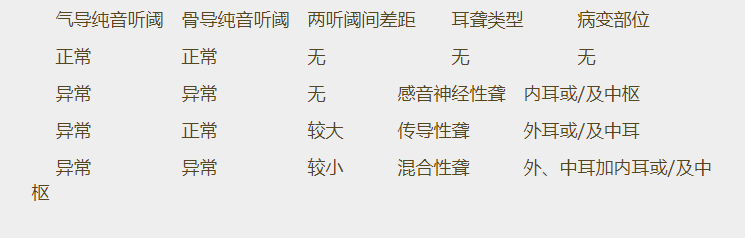 純音聽力檢查結果體現為純音聽力圖。</p><p> 正常情況下我們是通過兩條途徑來感受聲音信號的——氣導途徑和骨導途徑。前者我們非常熟悉,從外耳到中耳到內耳到聽中樞;后者我們或許不太注意:從顱骨直接到內耳到聽中樞。相應地,純音聽力檢查也有兩種聲音剌激方式,氣導輸入和骨導輸入。前者我們天天使用,而后者則很少被我們使用。事實上,兩閾值曲線的異同正是我們判斷聽損病變部位的基礎(見下表)。了解患者病變部位對于獲得他們的信任以及確定助聽器電聲性能都有非同尋常的意義。因此,有條件的時候還是應當重視骨導聽閾測試。</p><p style="text-align: center;"><img src="/upfiles/201906100237368907.png" alt="" /><br /></p><p> 更多詳情請登錄聽覺有道助聽器m.guisn.com</p>" />
