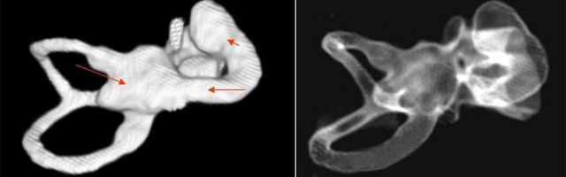 先天性內耳畸形的疾病種類繁多,診斷比較困難,隨著高分辨CT和磁共振(MRI)的應用,目前診斷率不斷提高。臨床常見的內耳畸形包括大前庭導水管綜合癥、先天性耳蝸畸形、米歇爾聽障及沙伊貝聽障。本篇將后三種畸形介紹如下:</p><p> 先天性耳蝸畸形(Congenital cochlear malformation)</p><p> 先天性耳蝸畸形又稱Mondini內耳發育不全,是最常見的一種內耳畸形。</p><p> 1、病因</p><p> 本病可為常染色體顯性或隱性遺傳病,也可為非遺傳性因素,如風疹病毒感染、過多的放射線暴露以及反應停類藥物等引起。</p><p> 2、臨床表現</p><p> 先天性耳蝸畸形包括耳蝸扁平、耳蝸發育不良,特別是第二圈和頂圈發育不良,兩者合并為一個腔;前庭擴大,巨大的前庭導水管以及半規管畸形、內耳道擴大等癥。在具體病例中不一定以上所有的畸形同時出現,可僅出現其中一種或幾種畸形。</p><p> 3、聽力學表現</p><p> 出生即無聽力,或1~2歲時才出現聽力減退,主要為感音神經性聽障,部分可為混合性聽障,有部分患者可長期保存殘余聽力。個別患者可有眩暈發作。</p><p> 4、診斷</p><p> 主要根據聽力學表現和影像學檢查。通過高分辨CT可看到耳蝸畸形。內耳MRI顯示膜迷路內水充盈,耳蝸扁平,耳蝸第二圈與頂圈間隔缺損,以及半規管、前庭的畸形。</p><p> </p><center><img alt="" src="/upfiles/201903250158493159.png" width="640" height="200" /></center><p></p><p> 先天性耳蝸畸形伴前庭和外半規管發育不良</p><p> 5、治療</p><p> 目前尚無有效的治療方法。如有殘余聽力,可佩帶助聽器后進行語言康復。無殘余聽力或極重度聽障患者可考慮人工耳蝸植入。</p><p> 米歇爾聽障(Michel’s deafness)</p><p> 屬常染色體顯性遺傳,是最嚴重的內耳畸形,內耳可完全未發育,可伴有其它器官的畸形和智力障礙。</p><p> 1、診斷</p><p> 主要依靠顳骨高分辨CT和內耳MRI。</p><p> </p><center><img alt="" src="/upfiles/201903250158577271.png" width="640" height="160" /></center><p></p><p> 雙側內耳畸形:左側無內耳迷路及內耳道機構,為米歇爾畸形;右側空耳蝸及前庭擴大,為先天性耳蝸畸形</p><p> 2、治療</p><p> 目前無特殊辦法,此類病例不適合行人工耳蝸植入術,但是聽覺腦干植入術的適應癥,其效果有待進一步證實。</p><p> 沙伊貝聽障(Scheibe dysplasia)</p><p> 為常染色體隱性遺傳,是最輕的內耳畸形,畸形僅限于蝸管和球囊,故又稱耳蝸球囊型畸形。</p><p> 1、診斷</p><p> 主要根據先天性聽損和MRI檢查</p><p> 2、治療</p><p> 此病可選擇性地行人工耳蝸植入術。</p><p> 更多詳情請登錄聽覺有道助聽器m.guisn.com</p>" />