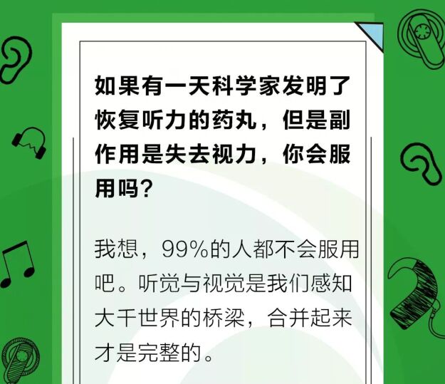 2019年3月29日聽覺有道推出一個全新的欄目內容<br /> 一本正經地奇思妙想<br /></span><p><span style="font-size:16px;"> 內容全靠一張圖:</span></p><p style="text-align: center;"><span style="font-size:16px;"><img src="/upfiles/201903290834583126.jpg" alt="" /><br /></span></p><span style="font-size:16px;"> 言語雖然不多僅僅三兩句<br /> 大家隨便看看就行了<br /> 可我們一定得往心里去啊<br /> 嚴肅點:愛耳君估計,99%的人心里都在想,誰會那么傻會做“拆東墻補西墻”的事情呢。<br /> 在現實中,很多恢復聽力藥物的研究就尚處于這個階段,我們在新聞上看到科學家已經可以讓小老鼠通過注射藥物等方式恢復聽力,然而我們沒有看到的是,這類方式目前還不能控制其極大的副作用,這種副作用可不僅僅是失明那么簡單,有可能還會丟掉性命。<a href="http://m.guisn.com/listDetail.aspx?id=102818" target="_blank"><strong><span style="color:#3333ff;">五個不容易被察覺的耳部疾病</span></strong></a><br /></span><p><span style="font-size:16px;"> 誠然,科研的每一分進步都難得可貴,未來會是怎樣的,愛耳君不知道。愛耳君希望有朝一日科學家能真正發明出一款“沒有副作用”的藥丸,讓全天下聽障人士都能恢復聽力。但我們也需正視現實把握當下,早發現、早干預、早治療。</span></p><span style="font-size:16px;"> 相關推薦閱讀:<a href="http://m.guisn.com/listDetail.aspx?id=102841" target="_blank"><strong><span style="color:#3333ff;">如何正確應對聽力損失?聽力保健的8大誤區</span></strong></a><br /><br /><br /> 聽覺有道助聽器價格:http://m.guisn.com/products.html<br /><br /> 發布于2019年3月29日 星期五<br /><br /> 上午8:36分</span>" />