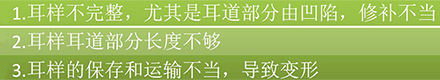 耳樣是定制機外殼制作的原型,耳樣的好壞直接影響到外殼完成后的密封性和舒適度,病人的聽力損失越重,對耳樣的要求也越高。在耳樣這一環節的如下情況將導致定制機嘯叫:
