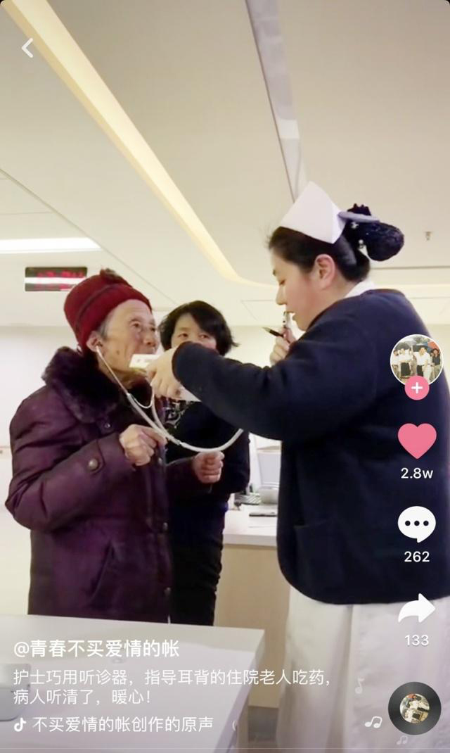 <span style="white-space:pre"> </span>“一天吃幾個呀?”<br /><br /> “一天三次,一次兩顆!”<br /><br /> “哦,一天三次,哦哦。”<br /><br /> 短短的三句話,15秒。<br /><br /> 一條護(hù)士用聽診器當(dāng)“臨時助聽器”,為一位耳背老奶奶講解用藥方法的抖音視頻在網(wǎng)上熱傳。<br /><br /> 視頻中的老奶奶是住在醫(yī)院的79歲老人,有點耳背,用聽診器說話的是護(hù)士黃艷,拍攝者是另一位護(hù)士蔣夢婷。當(dāng)時,老奶奶不知怎么吃藥,小黃喊了半天,奶奶也沒聽清,于是靈機(jī)一動,就把聽診器用上了。一旁的小蔣順手就把視頻分享到微信朋友圈里。<br /><br /> 友好醫(yī)院工作人員把這段視頻做成一條抖音視頻,以網(wǎng)名“青春不買愛情的帳”發(fā)送。“青春不買愛情的帳”說,本來就想與同事和朋友分享一下醫(yī)院護(hù)士既機(jī)智又暖心的行為,沒想到僅一天的工夫,竟獲百萬點擊量,數(shù)萬個贊。<br /><br /> “看到節(jié)節(jié)飆升的點擊量,我非常激動。”“青春不買愛情的帳”說,可以看出人們對醫(yī)護(hù)人員這個行業(yè)的關(guān)注。<br /><br /> “我們對老人一個小小的關(guān)愛行為,竟引起網(wǎng)友的強(qiáng)烈反響,可以看到我們社會充滿愛。”<br /><br /> 除了熱情點贊,還有不少網(wǎng)友發(fā)表了評論。<br /><br /> “給這個職業(yè)的工作者點贊,她們的真的很偉大,也很不容易。”<br /><br /> “最美護(hù)士!”<br /><br /> “太贊了,真是暖心一幕。”<br /><br /> “這個職業(yè)工作者不容易,為這個護(hù)士姐姐點贊。”<br /><br /> 還有的網(wǎng)友打趣,表示學(xué)到了一招:“太有才了,聽診器開發(fā)出新用途。”<br /><br /></span><p><span style="font-size:16px;"> “對這個可以。心臟不好的聽心臟;肺不好了聽肺;嗓子不好了,可以當(dāng)喇叭使;耳朵不好了可以當(dāng)助聽器。”</span></p><p style="text-align: center;"><span style="font-size:16px;"><img src="/upfiles/201907240350126074.jpg" alt="" /><br /></span></p>" />