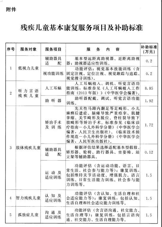 1.視力、聽力言語、肢體、智力殘疾兒童和孤獨癥兒童救助參照國家和自治區現行標準執行(詳見附件)。