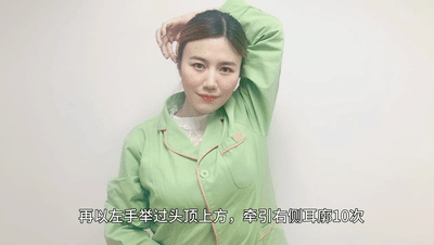 右手舉過頭頂上方,牽引左側耳廓10次;再以左手舉過頭頂上方,牽引右側耳廓10次。