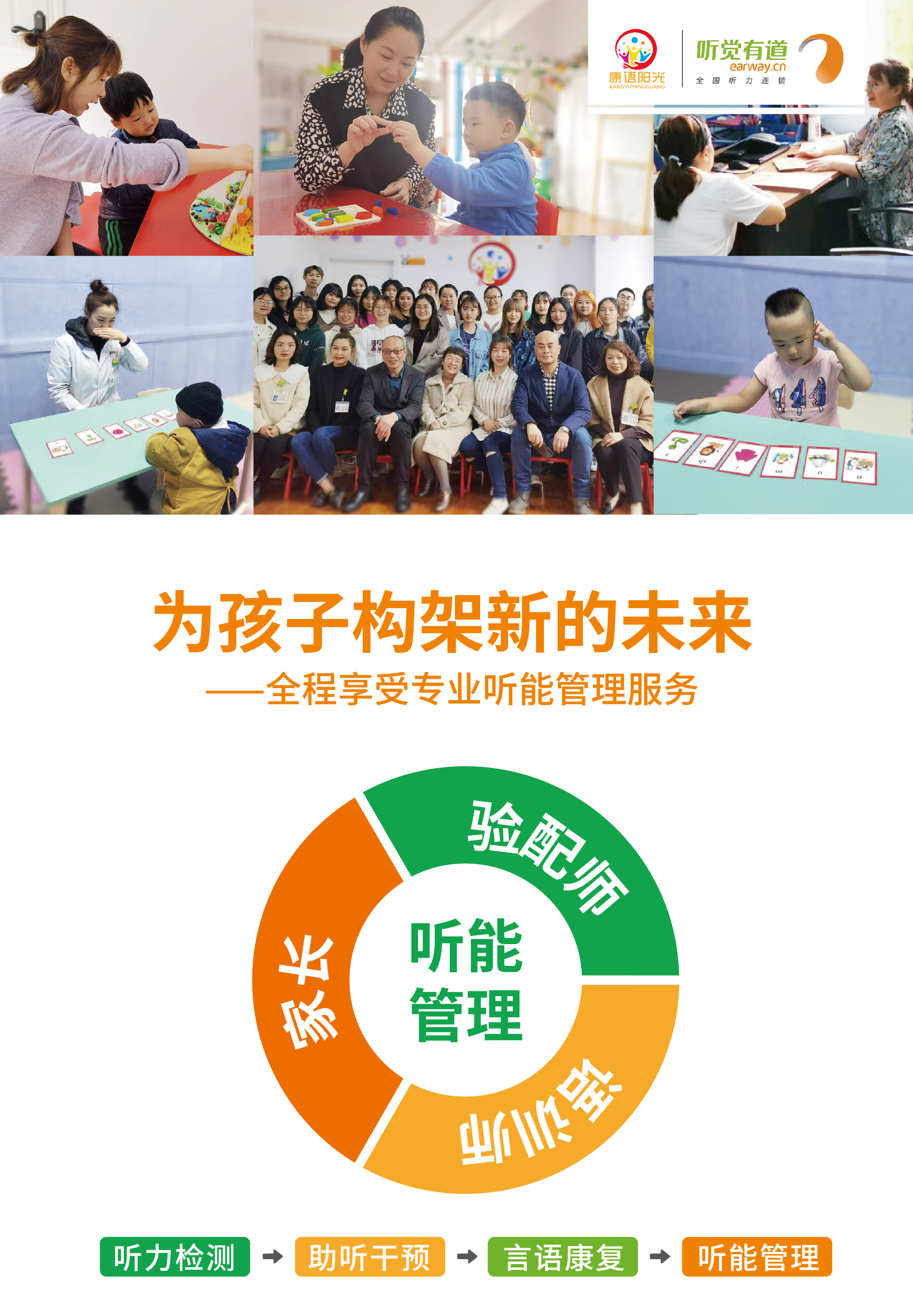 聽能管理,是通過驗配師、語訓師和家長共同協作,對聽障寶寶的聽覺狀況、助聽效果及語訓情況進行動態觀察和主動評估,提高助聽效果及語訓質量,縮短語訓時間,讓家長少走彎路,讓寶寶盡快進入正常幼兒園,融入主流社會。