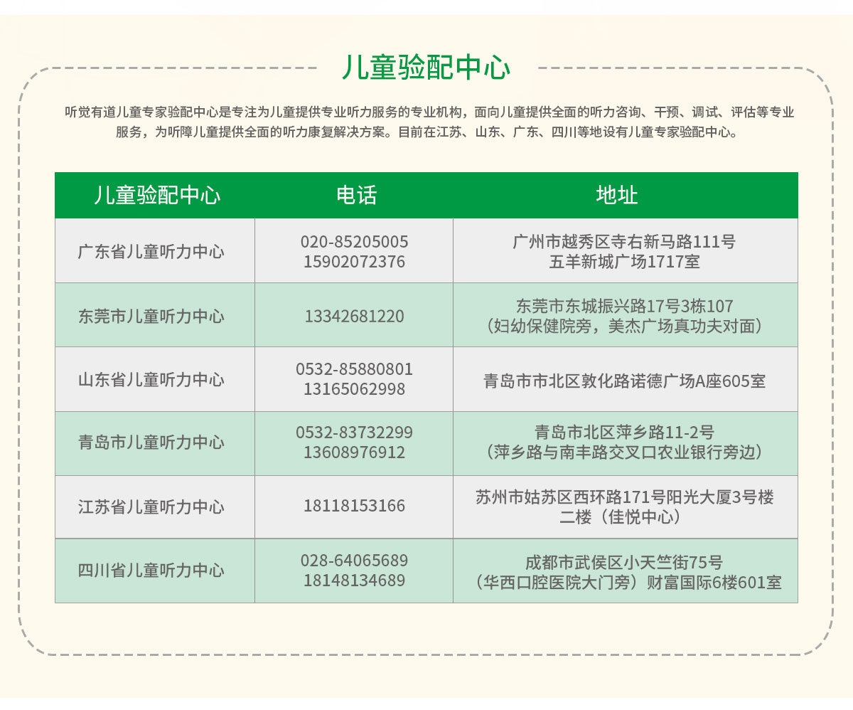 聽覺有道兒童專家驗配中心是專注為兒童提供專業(yè)聽力服務(wù)的專業(yè)機構(gòu),面向兒童提供全面的聽力咨詢、干預(yù)、調(diào)試、評估等專業(yè)服務(wù),為聽障兒童提供全面的聽力康復(fù)解決方案。目前在江蘇、山東、廣東、四川等地設(shè)有兒童專家驗配中心。